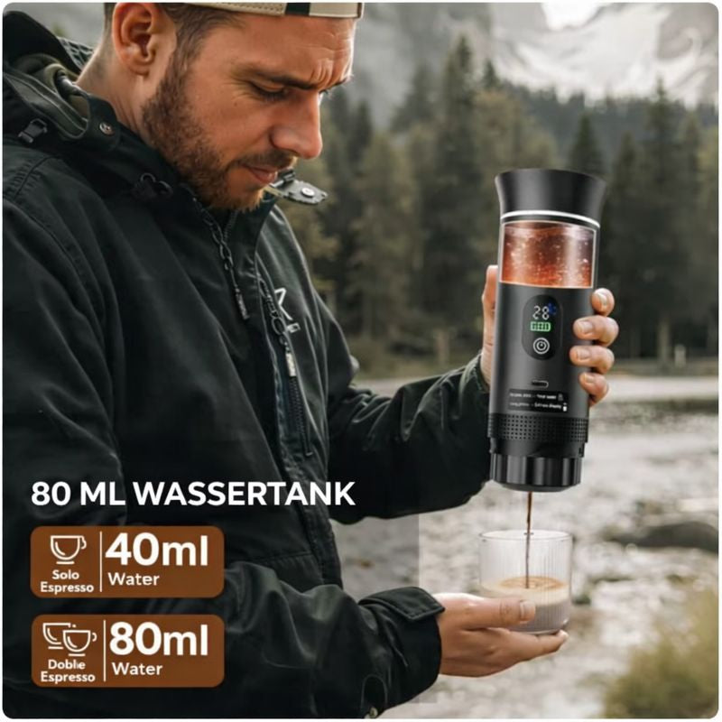 Dank ihres 80-ml-Wassertanks bietet Ihnen unsere tragbare Kaffeemaschine die Möglichkeit, im Handumdrehen zwischen einem einfachen (40 ml) und einem doppelten Espresso (80 ml) zu wählen.